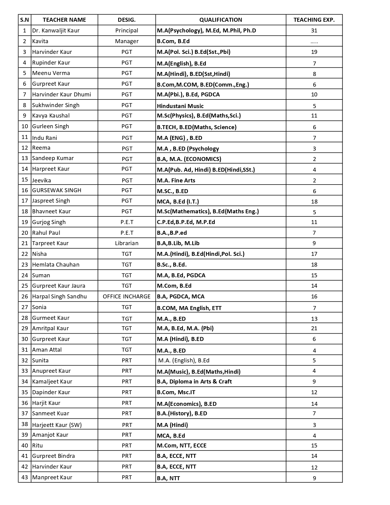 • Details of Teachers Including Qualifications